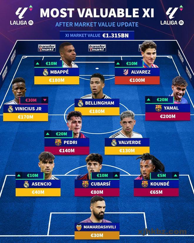 在更新了西甲球员身价后,德国转会市场网站列出了西甲最贵阵容,姆巴佩领衔皇马5人入选,亚马尔等巴萨4将在列。