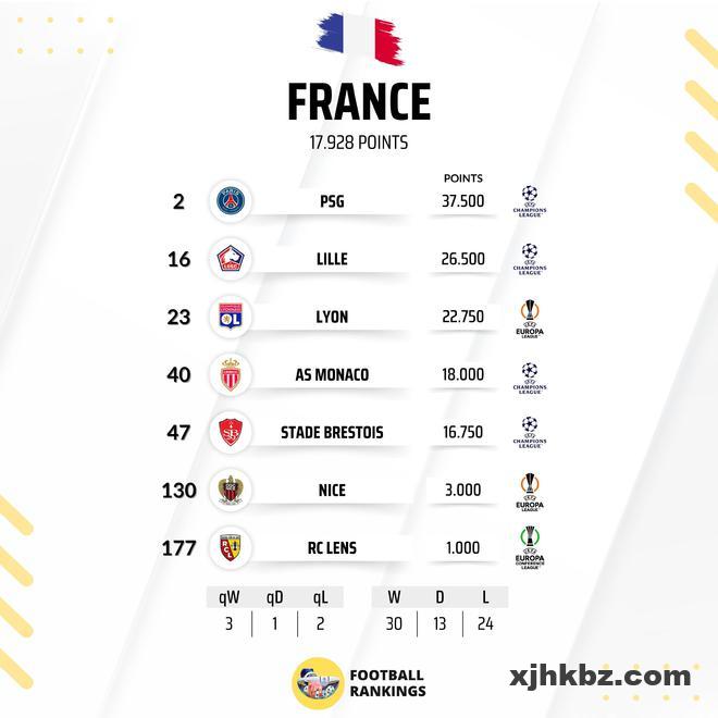 北京时间6月6日,数据机构 Football Rankings 公布了2024/25赛季法国俱乐部的欧战积分排名。巴黎圣日耳曼以37.500分排名全欧第2,但其他法国球队差距较大,尼斯与朗斯甚至排名百名开外。