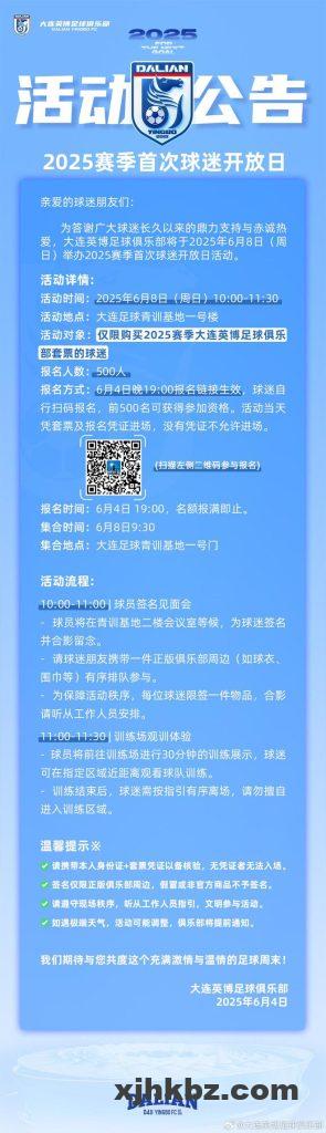直播吧06月04日讯 大连英博发布俱乐部 2025赛季首次球迷开放日活动公告,俱乐部将于6月8日举行球迷开放日活动。