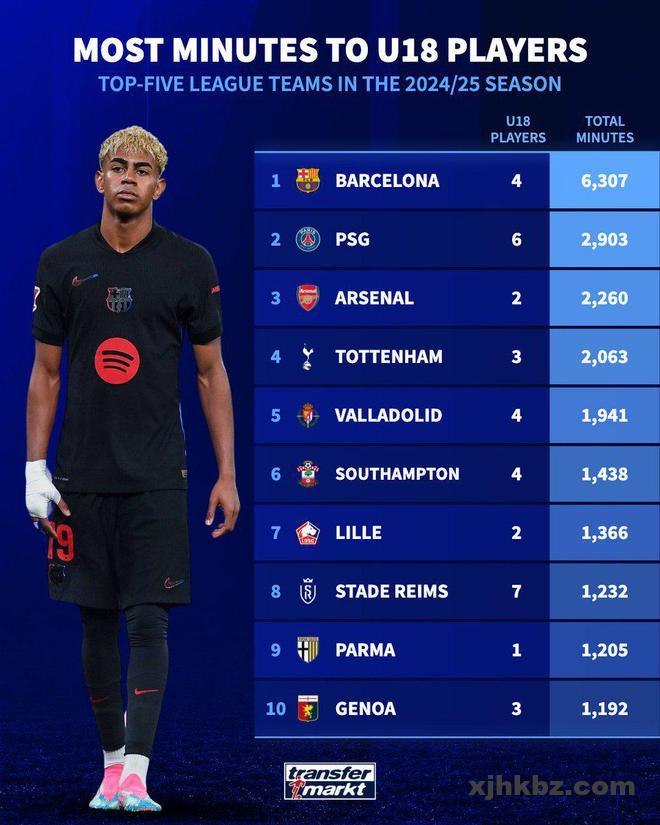 北京时间6月4日,德国转会市场公布了2024-25赛季五大联赛U18球员使用时间,其中巴塞罗那断层领跑榜单,巴黎圣日耳曼位列第二。