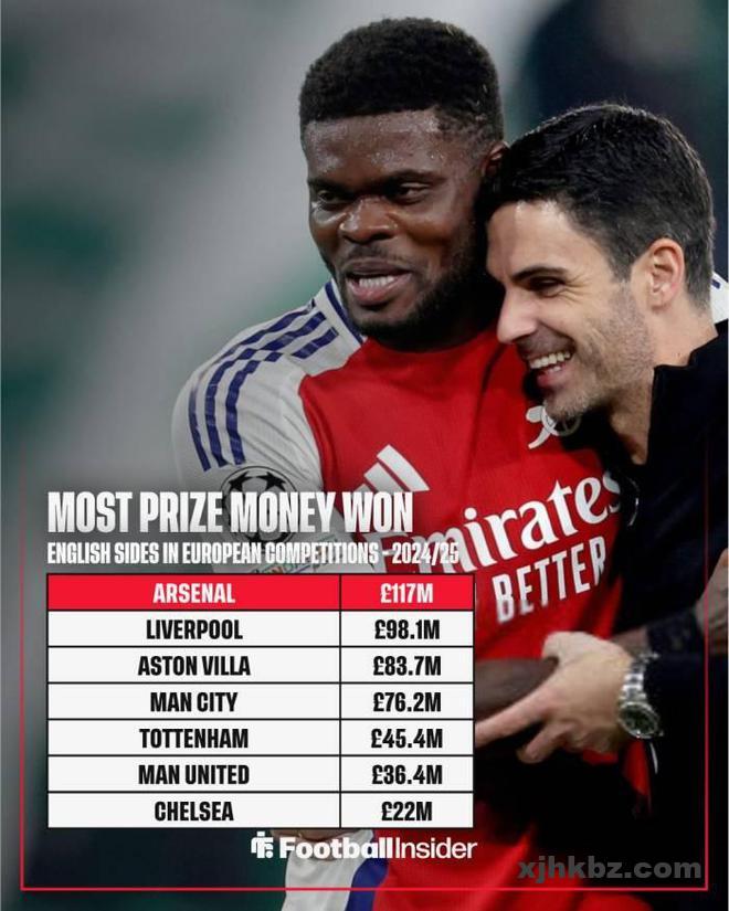北京时间5月30日,据统计,阿森纳在2024/25赛季欧洲赛场的奖金收入高居英格兰俱乐部之首。阿森纳本赛季在欧战赛事中共获得了1.17亿英镑的奖金,超过了英格兰其他所有参赛俱乐部。其中,欧联夺冠的热刺排名第五,欧协联夺冠的切尔西则排名垫底。
