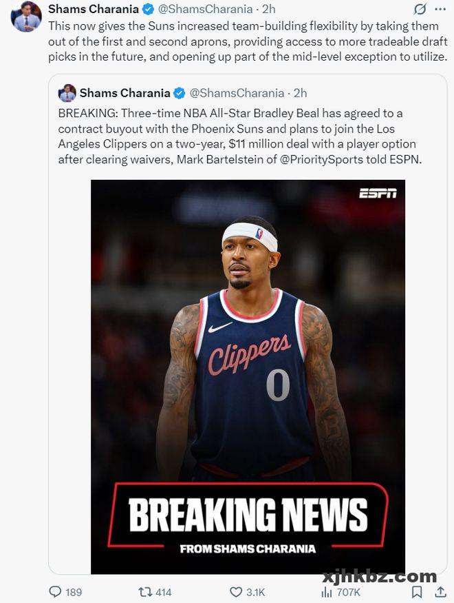 北京时间今日,据太阳队官方消息,比尔与球队达成买断,同时Shams报道称比尔将会以2年1100万美元的合约加盟快船。