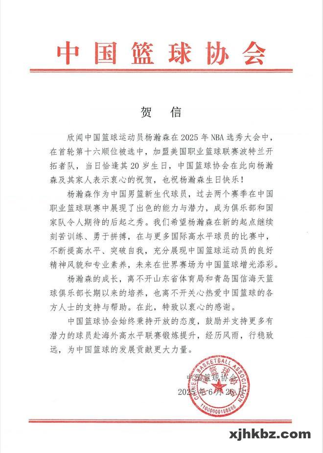 北京时间6月26日,2025年NBA选秀大会中,中国球员杨瀚森在首轮第十六顺位被选中,加盟波特兰开拓者队。今天也是杨瀚森的生日,中国篮协向杨瀚森致信祝贺。