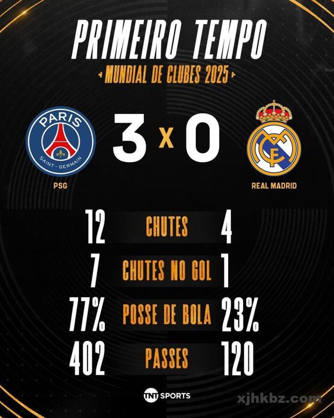 直播吧07月10日讯 世俱杯半决赛,巴黎对阵皇马,半场巴黎3-0领先。半场数据如图所示。